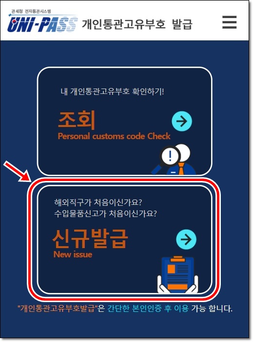 접속하시면 아래와 같은 메인 화면이 보일 거예요. 여기서 [신규발급]을 선택해 주세요.