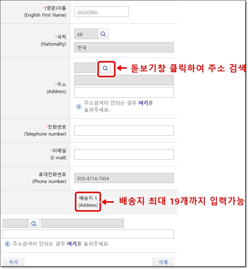 - 주소: 현재 거주 중인 주소를 검색해서 입력하세요. (물품 배송지와 달라도 상관없습니다.)
