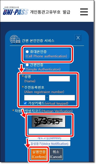 3. 성명과 주민등록번호를 입력하고 본인인증(카카오, 패스, 문자 등)만 하면 즉시 P로 시작하는 13자리 번호가 뜹니다.(잘모르시면 문자인증 추천!)