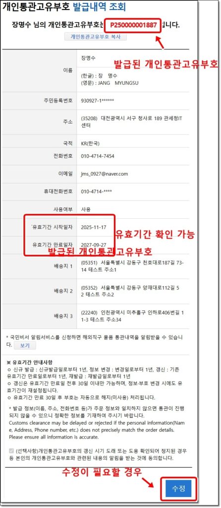 - 전화번호 변경: 번호를 바꿨는데 수정하지 않으면, 통관 진행 상황이나 관세 납부 알림 문자(카톡)를 받지 못해 물건이 반송될 수 있습니다.