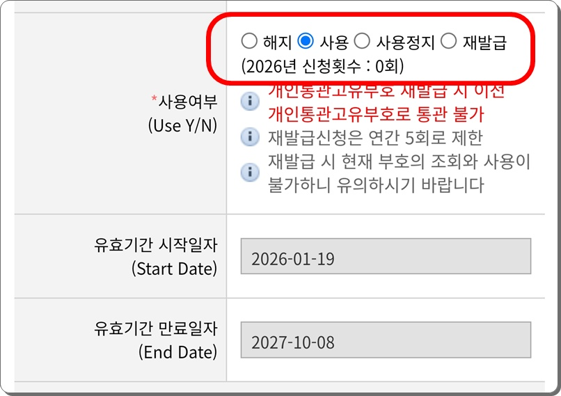 - [사용여부] 항목에서 **[사용정지]**를 선택하면, 내가 다시 [사용]으로 풀기 전까지는 누구도 내 번호로 통관을 진행할 수 없습니다.